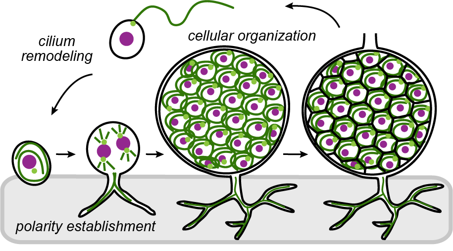 Cells reorganize their shape and contents in space and time to move and divide. These complex behaviors are driven by networks of intracellular polymers called the cytoskeleton. Using the same nanometer-scale building blocks, cells build different micron-scale structures like microtubule-based spindles that generate force to segregate DNA, centrosomes that organize polarized arrays to pattern the cell, and cilia that beat to generate force for fluid flow and motility. As cells transition between states, these structures are remodeled to meet new needs. Defects in these cytoskeletal structures cause human diseases including ciliopathies (e.g. polycystic kidney disease, primary ciliary dyskinesia, infertility) and cancers. We use cell biological and biophysical approaches combined with high-resolution microscopy to investigate the remodeling of microtubule-based structures critical for proper cell function.